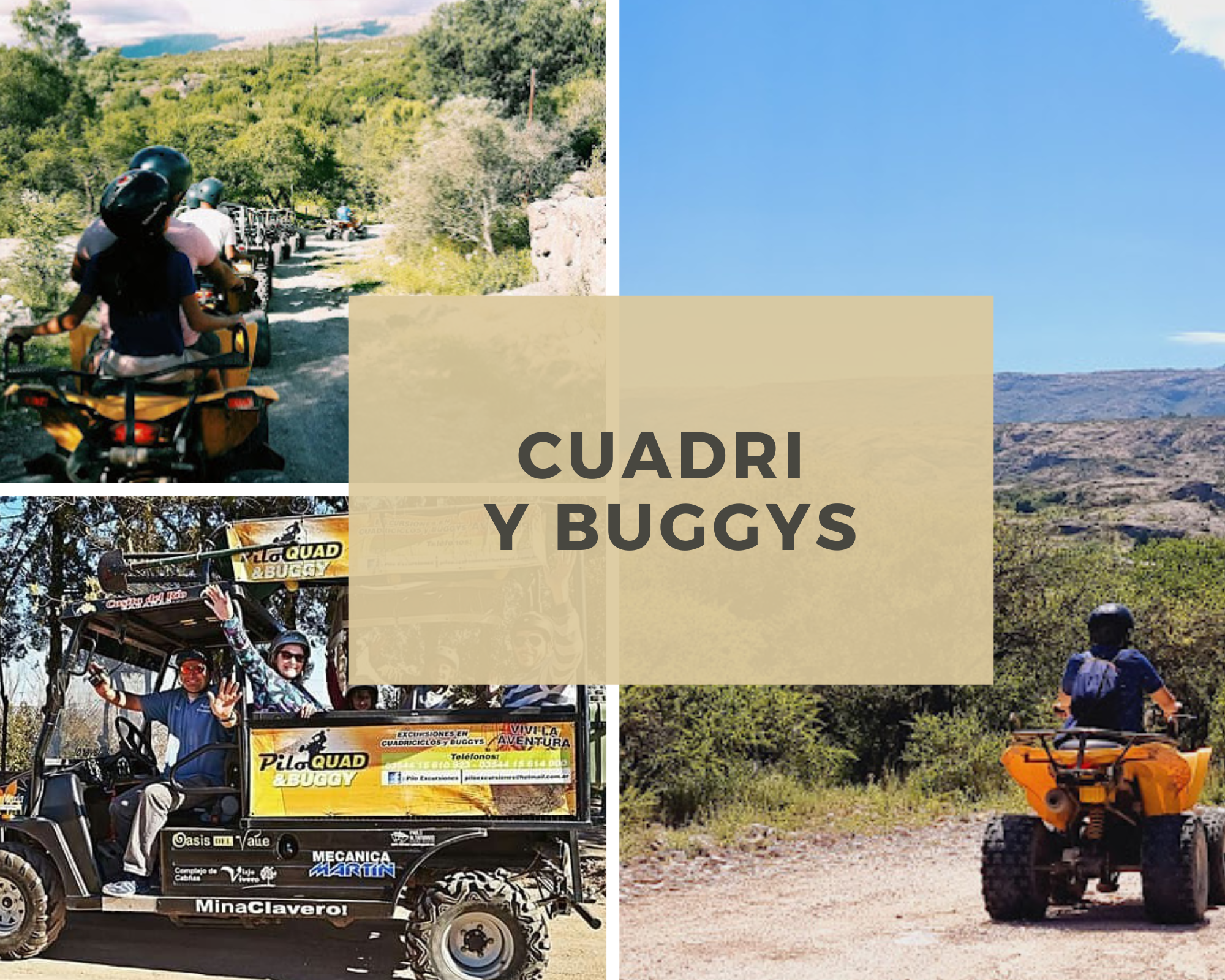 Hay 3 tipos de excursiones, la de UNA HORA en la cual vamos a Cañada Larga que es un paraje en las Montañas, pasando por Nido del Águila, dicha excursión no tiene parada y en cada vehículo pueden ir hasta dos personas. También tenemos la de DOS HORAS Y MEDIA, en la que hacemos parte del Camino de los artesanos/Camino del peregrino, hasta llegar a un balneario que se llama LA TOMA donde hacemos una parada para que conozcan el rio y luego continuamos hasta un puesto de cerámica negra artesanal, allí nos brindaran una charla informativa (para esta opción pueden traer traje de baño), y si no una salida NOCTURNA de aprox 4 hs, en la cual vamos a Villa Benegas, un paraje en las Sierras donde comemos chivito, incluye comida, bebida, y paseo. Los horarios son: UNA HORA sale a las 12:30hs y a las 17:30hs. DOS HORAS sale a las 10:00hs y a las 15:00hs. NOCTURNA a las 20:30hs. Por reservas: De una hora y dos horas con hasta 2 horas de anticipación. Para la salida nocturna debe ser antes del mediodía para hacer la reserva de la comida y con una seña en efectivo. El mínimo de vehículos para la misma es de 2 (dos). Recordamos que solo mayores de 18 años pueden manejar, en el caso de buggys deben poseer licencia de conducir y para los cuadris deben saber manejarlos. Se les pide a los pasajeros estar en el lugar 10 minutos antes del horario de salida.